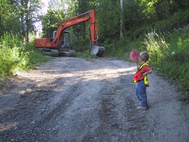 Our oldest boy's big thrill came when Jamie asked him if he wanted to go for a ride in the excavator and then for ten ecstatic minutes, he sat with Jamie and hung on to the controls as Jamie operated the machine. Jamie let him push a button or two and move the levers a bit as they dug, scraped and even picked up a big rock with the bucket and thumb. He was in kid heaven.
